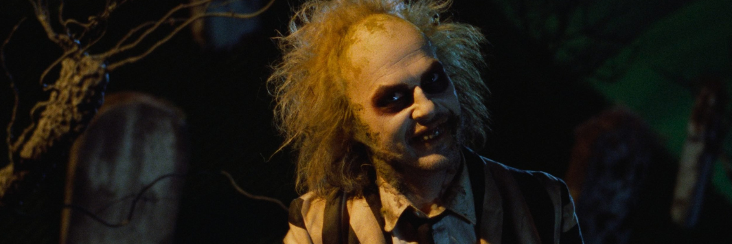 It's showtime! The 1988 Tim Burton classic that started it all. When a recently deceased couple finds their dream home invaded by an insufferable new family, they hire the services of Beetlejuice, a crude and mischievous "bio-exorcist" from the afterlife. Starring Michael Keaton in his iconic role as the striped-suited ghost, along with Alec Baldwin, Geena Davis, and Winona Ryder, this darkly comedic masterpiece blends Burton's gothic visual style with outrageous humor and unforgettable practical effects. From the haunting "Day-O" dinner scene to Beetlejuice's wild antics, this film became an instant cult classic and cemented its place in pop culture history, spawning an animated series, a Broadway musical, and decades of devoted fans.